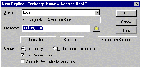 要从下游 Lotus Notes 服务器启用 Exchange Server 目录复制,必须将 Lotus Notes 桥头服务器上的 Exchange Server 通讯簿 (Exchange.nsf) 复制到下游 Lotus Notes 服务器上。启动 Lotus Notes 客户,并连接到下游 Lotus Notes 服务器。在 File 菜单上,单击 Replication,然后单击 New Replica。当出现以下对话框时,从 Server 列表中选择 Lotus Notes 桥头服务器:本方案中为 NOTES_SRVR1/NOTES_ORG。在 Database 列表中,双击 Exchange Name & Address Book。