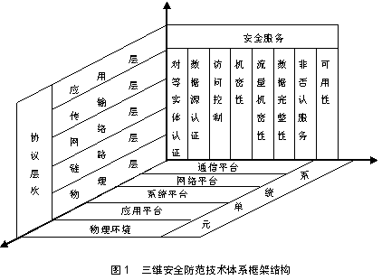 为了能够有效了解用户的安全需求,选择各种安全产品和策略,有必要建立一些系统的方法来进行网络安全防范。网络安全防范体系的科学性、可行性是其可顺利实施的保障。图1给出了基于DISSP扩展的一个三维安全防范技术体系框架结构。第一维是安全服务,给出了八种安全属性(ITU-T REC-X.800-199103-I)。第二维是系统单元,给出了信息网络系统的组成。第三维是结构层次,给出并扩展了国际标准化组织ISO的开放系统互联(OSI)模型。