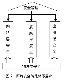 作为全方位的、整体的网络安全防范体系也是分层次的,不同层次反映了不同的安全问题,根据网络的应用现状情况和网络的结构,我们将安全防范体系的层次(见图2)划分为物理层安全、系统层安全、网络层安全、应用层安全和安全管理。