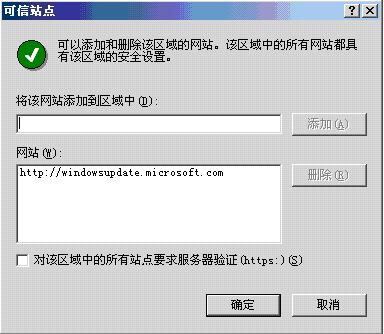 4. 在受信任站点对话框中,输入网站的URL在“将该网站添加到区域中”的对话框里,并且点击添加。受信任站点的特点是只能用以Http:开头的URL。取消对该区域中的所有站点要求服务器验证的选项。