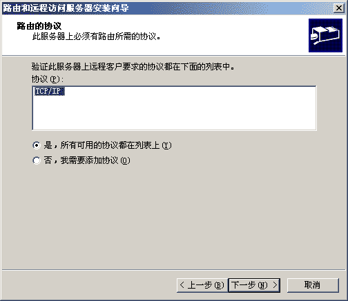 4、继续单击“下一步”按钮,系统将弹出“路由协议”的向导窗口,该窗口将询问你选择哪种路由协议;此时你可以选中该窗口列表中的“TCP/IP”协议,再选中“是,所有可用的协议都在列表上”选项,如图5所示;