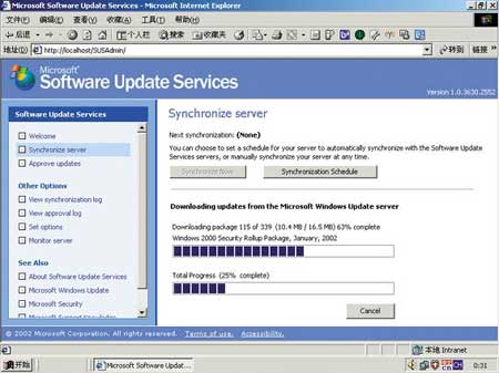 安装完毕后,系统自动打开SUS管理程序。它基于Web界面,用户也可从“管理工具”界面中直接运行。首先,是服务器同步。即SUS从Windows Update站点下载所有的Windows 2000 SP2之后的补丁程序,并保存到本地硬盘中。在SUS管理界面中选择“Synchronize Server”*“Synchronize Now”即可(如图1所示)。以后,同步操作就不必采用这种手动方式了,用户可以通过SUS的“Synchronize Schedule”计划功能实现自动同步,这样可以避免错过那些重大的安全更新。另外,用户也可以从Microsoft网站订阅安全更新通知,只需在http://go.microsoft.com/fwlink/?linkid=6931站点登记即可。需要提醒您的是,第一次同步所花费的时间比较长,这主要是因为目前SUS只通过语言类型来约束补丁下载,不能让用户任意选择补丁进行下载。