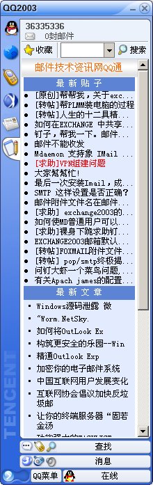 为了更好地方便大家讨论和了解最新的邮件技术资讯网的内容,我们充分利用新版QQ(2003IIIbeta4简体测试版以上版本)推出QQ第六面板——自定义面板。利用自定义面板的网址收藏功能,QQ用户可以在这个面板里实时登录浏览本站的最新文章。