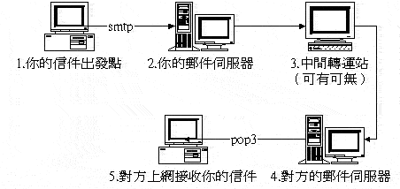 认识邮件运送的过程 基本上,当你使用 E-Mail 讯息时,信件是如何运送的呢?通常是如下图这样运送的: ![]() 你的信件将经过 smtp 协议传送至 邮件服务器 ,然后邮件服务器将视有无设定转信主机(Mail eXchanger, MX),若有转信主机,则信件先经过转信主机后再传到目的邮件服务器,若无转信主机,则信件将直接由你的邮件服务器送至目的邮件服务器,最后,由你的收件者以 pop-3 协议,将信件由对方的邮件服务器中捉下来!举个例子来说,如果你要从 kimo 寄信给鸟哥的话(tsai.adsldns.org),那信件是如何传送的呢? 1. 你在 Windows 系统中写完了信,以 smtp 协议将你的信传送至 kimo.com.tw 这个邮件服务器; 2. kimo.com.tw 这个邮件服务器将你的信转送至鸟哥的 tsai.adsldns.org 这个邮件服务器; 3. 鸟哥在 Windows 系统中,以 pop-3 协议将这封信由 tsai.adsldns.org 捉下来计算机中! 大致的流程就是这样而已。底下来说说一些邮件的术语: · MUA(Mail User Agent ):照字面的意义来说,就是所谓的『邮件代理人』,MUA 从字面上看似乎好容易给它吓死﹐但说穿了您可能会笑耶﹕我们平时用的 Outlook Express、Netscape Mail,或是 Linux 上面的 pine ﹐它们都是 MUA 。简单说﹐MUA 是用来给使用者流览邮件和书写邮件的程序; · MTA(Mail Transfer Agent ):照字面的意义来说,就是『邮件传送代理人』,我们管它叫邮件服务器好了﹐它负责 MUA 的请求﹐也负责将邮件从一个 MTA 传到另一个 MTA 。通常一个 MTA 都可以支持好几种邮件协议﹐例如﹕ UUCP、SMTP、POP 等。 UUCP (Unix to Unix Communication Protocol) 现在已经比较少用了﹐取而代之的是 SMTP (Simple Mail Transfer Protocol) 和 POP (Post Office Protocol) 这两个协议。 SMTP 负责的将邮件从 MUA 上传给 MTA﹐也是 MTA 和 MTA 之间的邮件传递协议﹔而在没有 POP 之前﹐email 的使用者一般都要用 telnet 或其它远程控制程序连上 MTA 那里﹐然后在那里阅读邮件﹐而有了 POP 之后﹐ MTA 可以将使用者的邮件存在一个档案里﹐然后使用者通过 MUA 连到 MTA ﹐再将信件下载回本地机器阅读。另外﹐ MUA 和 MTA 都无需是同一个厂家的软件﹐只要双方都支持 POP 协议就可以了﹐其灵活性是不言而喻的了。有些程序﹐如 sendmail ﹐表面来说﹐就同时具备 MUA 和 MTA 功能了。 · 我们用 MUA 撰写邮件之后﹐是通过 SMTP 协议上传给 MTA 的﹔而阅读邮件则是通过 POP 从 MTA 那里下载回来。 Mail 与 DNS 的相关性: 与 mail 最具相关的大概就是 DNS 的设定了,例如你要寄信给我的话,就要寄到 vbird@tsai.adsldns.org 这个信箱,因此,如果你要架设邮件服务器的话,请务必将你的 DNS 设定正确!否则一定信件是寄不到你的信箱的喔!而由于我们是使用 ADSL拨接系统 来上网的,所以只好申请动态 IP 啰! ----------------------------------------------------------------------------------------------- 简易的设定 sendmail 开始设定前的准备工作: 在开始设定你的邮件服务器之前,请先让你的主机具有 DNS 可以追查到的功能啰!申请 DNS 主要有两种方法: · 若你在学术系统中,你可以直接向您的上一层 DNS Server 的管理员申请,由于你具有固定 IP ,所以架设上会很方便; · 再来,如果你与我相同是使用 ADSL拨接系统 的话,由于没有办法具有固定 IP,所以只好申请动态 IP 的 DNS 系统了,详细的申请步骤请至『动态 DNS 申请』中察看。 请千万注意,由于 DNS 设定错误将使你的信件无法收取(不过发信可能没有问题!)因此这一部分请仔细的设定喔! 设定 sendmail : 如果你是使用这个网页介绍的 Redhat 6.1 来安装你的 Linux 的话,那在你安装好了 Linux 时,你的邮件服务器已经架设好了!不相信吗?假设你的 ID 是 test,则你可以进入 Linux 之后,输入这样的字眼: 然后你只要输入 mail 即可收信喔! 简易的设定 sendmail 虽然你的 Linux 已经具有收发信件的能力,但是你也可以看到,上面的例子中,所显示的邮件主机是 localhost.localdomain ,这是不对的!寄给别人的信也是使用这一个名称的话,当然人家一定寄不到你这里来啦!所以要设定一下你的 sendmail 啦! · netconf 设定邮件服务器: 基本上,设定邮件服务器只要两个步骤: 1. 一个是使用 netconf 简易的设定好主机的名称与其它与主机相关的事项; 2. 然后再修改 /etc/inetd.conf 这个档案,开启 pop-3、smtp 及 imap 的服务即可! 这个 IMAP 是目前新的邮件协议﹐通过 IMAP﹐ 使用者在 MUA 那端就无需分别指定 SMTP 和 POP 作为上传和下载协议了﹐而只一个 IMAP 协议就可以﹐而且 IMAP 还可以让不同的使用者共享一个 MUA﹐非常方便哦。 netconf:好了,现在来设定一下主机吧: 1. 以 root 的身份执行 『netconf』,会出现一个窗口; 2. 向下移动光标到 『Mail delivery system (sendmail)』 这一项,并按下 enter 键; 3. 在出现的框框中选择 『basic information』 这一项; 4. 在 『Present your system as』 及 『Mail server』 这两个地方,都输入你在 动态 DNS 系统中申请到的名称(以我为例,在这两个地方都输入 tsai.adsldns.org 即可);另外,在这勾选两行中间的 『[X] Accept email for adsldns.org』 这一个咚咚,这样就设定好了! 5. 以 Tab 键将光标移动到 Accept 这一项,按下 enter,回到刚刚的画面; 6. 按一次 Quit 出来主选单,选择『Basic host information』这一项,按 Enter 进入; 7. 在 『Host name』的地方输入你的主机名称,另外,在 『Primary name + domain』 的地方也要输入一次刚刚输入的名称喔!(就是 hostname.adsldns.org这一个!); 8. 按下 Accept 退出来之后,回到刚刚的画面; 9. 由于 Redhat 