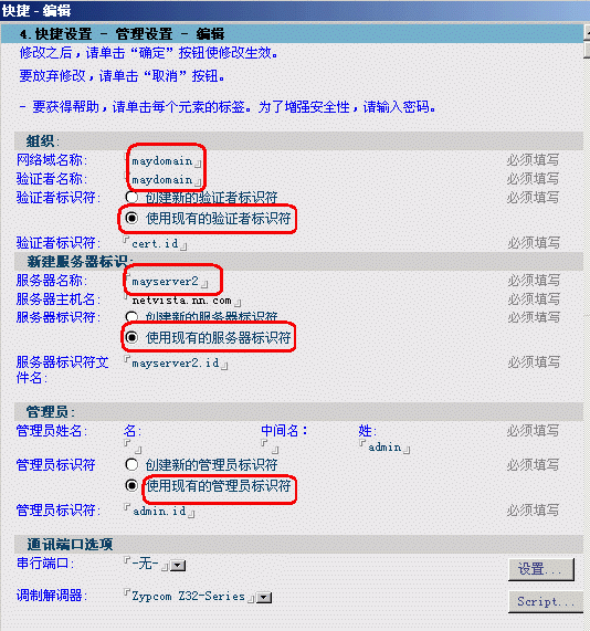 6。在快速配置中,输入主服务器的网络域名称,和附加服务器的名称以及管理员的名字,并把以上的标识符全都设置成“使用现有的XX标识符”,再把相应的ID的文件名写入XX标识符中。