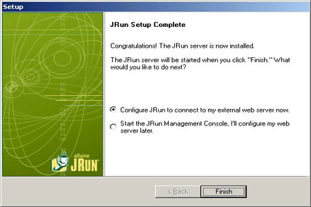 jrun3.0配合IIS的安装非常简单,先将IIS装好(难度系数为0),接着再来安装JRun3.双击jrun3.exe进入安装画面,在安装时你需要设置监听端口,一般默认的监听器端口是8000,另外还需要设置用户的密码,这儿的用户名是默认的admin,序列号可以不设,当然也可以用企业版的注册码:JR300EE-9900-6270-0000.最后就是选择SDK的目录.其它步骤都按默认的方式完成安装,在安装成功后会显示出如下面的图像图1,单击Finish后便完成了安装.