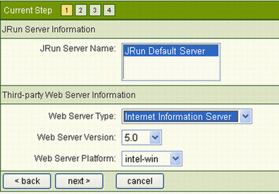 这是JRun默认的设置值,我们要把JRunServerName改为JRunDefaultServer,在这里我要特别强调一下,很多网上的资料都是让大家在这一步,除了改变JRunServerName的值外,别的便使用默认值.其实这样是完全错误的,大家想想看,我们现在是在安装了IIS的基础上来安装JRun插件,但是你们仔细看一下图中WebServerType的值,它在默认的情况下是ApacheWebServer,当然版本也是Apache服务器的版本,在确认这步时系统不会报错,但是在第三步时我们将不会找到ApacheConfig的路径.因为我们本来就没有安装过它.所以请大家一定要记着把WebServer Type的值改为IIS.而版本也会自动改变.如图3