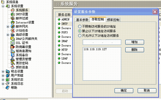 如果在 SMTP 日志看到经常有相同的地址通过邮件系统来发垃圾邮件,可以对其 IP 地址直接过滤,阻止其发送垃圾邮件。在“系统服务”->“SMTP”->“存取控制”中设置。