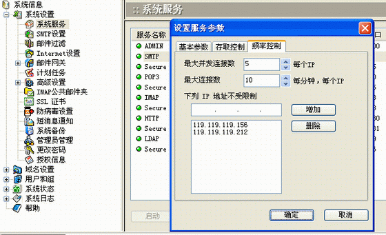 Winmail 可以对每个 IP 的同时连接服务器的最大连接数,每分钟每个 IP 允许连接的最大数进行限制,来防止过高发信频率,占用太高的网络带宽。在“系统服务”->“SMTP”->“频率控制”中设置。