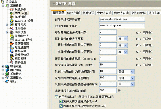 所谓无限制转发,就是任何人都可以使用您的服务器发送邮件。邮件系统安装完成后,一定要检查是否已经启用了发信认证功能,以防止别人借用您的机器来转发邮件。在“SMTP 设置”->“基本参数”中设置。