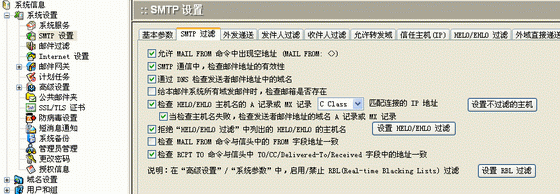 检查 HELO/EHLO 的主机名:在 SMTP 通讯过程中,发送端会发送 HELO/EHLO 命令,标准的协议中是跟随主机名或域名,可以直接过滤主机名和检查 HELO/EHLO 主机名的 A 记录或 MX 记录与连接的 IP 地址是否匹配。这样能有效的过滤垃圾邮件。如果经常在 SMTP 日志中看到类似的信息下面的信息,可以启用此功能。如果 DNS 服务器不是稳定的话,建议不要采用。在“SMTP 设置”->“SMTP 过滤”和 在“SMTP 设置”->“HELO/EHLO 过滤”中设置。中设置。