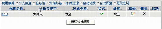 用户可以根据实际收到的邮件情况,来决定对某些邮件进行过滤。可以通过分析邮件中发件人,收件人,抄送,主题,Received,邮件头,邮件内容是否满足设定的规则。 用户可以通过 webmail 来增加,删除及修改自己的过滤规则。在用户 webmail 的“配箱箱”->“邮件过滤”中设置。
