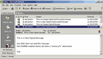 ---- 通过Outlook 2000或Outlook Web Access(OWA),系统管理员可以看出透明和不透明签名邮件的区别。浏览透明签名邮件的明文不需要S/MIME处理。Outlook 2000的预览窗口如图3所示,透明签名邮件的内容可以直接显示出来。但对于不透明签名邮件,系统管理员必须双击它,以便让S/MIME对邮件进行处理,才能看到内容。OWA不支持S/MIME,所以只能通过OWA的接口阅读透明签名的邮件;不透明签名的和加密的邮件则显示一个smime.p7m附件。