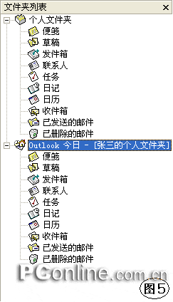 Outlook启动后,我们在菜单栏上执行“视图→文件夹列表”,如图5所示,“张三”的个人文件夹已变为“Outlook今日”文件夹了。在该文件夹列表中,还有一个叫“个人文件夹”的Outlook个人文件夹,这个“个人文件夹”就是我们给“张三”同学添加配置文件时,Outlook自动为“张三”创建的那个个人募校衷谖颐遣挥盟耍梢栽诟梦募猩系慊饔壹诳旖莶说ド涎≡瘛肮乇崭鋈宋募小本涂晒乇崭梦募小H绻阆搿罢恫莩保部梢栽谧试垂芾砥鞯奖4娓梦募奈恢贸沟咨境?br>