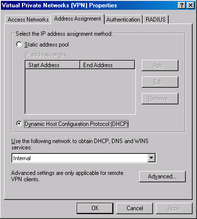 14. 点击 Address Assignment 标签, 在Use the following network to obtain DHCP, DNS and WINS services列表框中选择内部接口,这是个定义如何访问DHCP的重要设置。注意在这个例子中我们在内部网络中使用一个DHCP服务器来为VPN客户分配IP地址。除非你在ISA Server 2004防火墙/VPN服务器上安装了DHCP中继代理,否则DHCP服务器不会主动分配为VPN客户分配DHCP选项。你可以为建立一个静态地址池以为VPN客户分配IP地址,但是如果你选择使用静态地址池,你将不能为这些主机分配DHCP选项。同样的,如果你选择使用静态地址池,你要使用off-subnet网络ID,你可以在http://isaserver.org/articles/How_to_Implement_VPN_