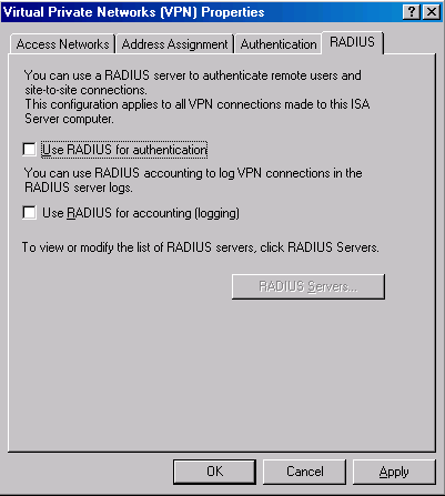 16. 点击 RADIUS 标签,在这儿你可以配置ISA Server 2004防火墙VPN服务器使用Radius来认证VPN用户。Radius认证的优点是你可以在活动目录认证或者对没有加入域的用户使用其他用户数据库的认证之间进行平衡。我们会在以后继续进行介绍。