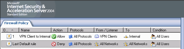 在重启后,ISA Server 2004防火墙已经准备好接受进入的VPN连接了。可是,因为没有访问策略允许,VPN客户端不能访问内网的任何资源。你需要建立一个访问策略以允许VPN客户网络访问内部网络。与其他混合的防火墙VPN服务器相对照的是,ISA Server 2004防火墙VPN服务器为VPN网络进行访问控制定义而不是VPN客户。