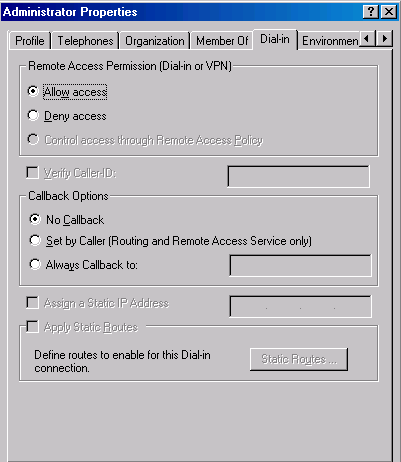 在非本地模式的活动目录域中,所有用户账户的拨入权限默认是禁止的。你必须为每个用户启用拨入权限。与之相对的是,在本地模式的域中,默认地,拨入权限受远程访问策略的控制。Windows NT 4.0域和非本地模式的域一样,由独立的用户账户来控制拨入权限。