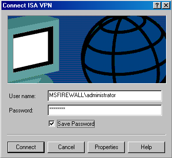9. 在 Connect ISA VPN 对话框,输入用户名 MSFIREWALL\administrator 和对应的密码,点击 Connect。