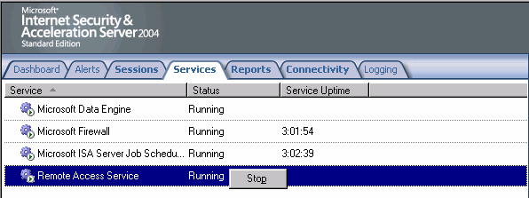 2. 在细节面板,点击 Services 标签,右击 Remote Access Service 然后点击 Stop。