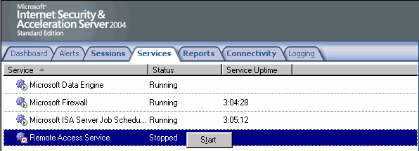 现在ISA Server 2004防火墙和VPN客户计算机都已经安装了证书,你可以测试从远程访问客户到防火墙建立一个安全连接。第一步是重启路由和远程访问服务以让它能使用新的证书。
