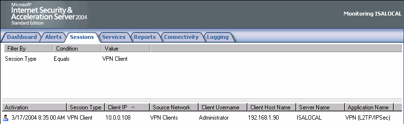 2. 现在你打开 Monitoring 节点的Sessions 标签,在这儿你可以看见当前的VPN会话。