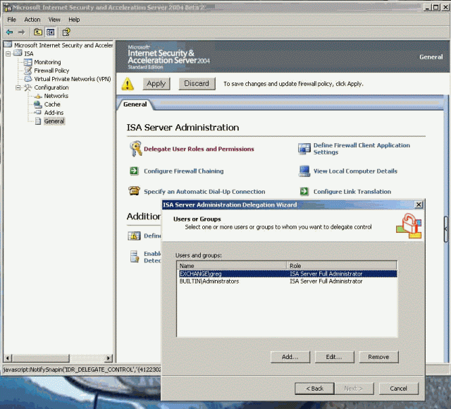 你同样也需要指定谁是ISA Server的管理员。在General 上选择Delegate User Roles and Permissions ,在那儿你可以加入或者编辑你的管理员。