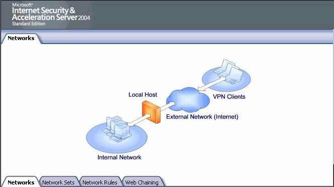 下图是ISA Server 2004对边缘防火墙模板的说明图。Internal Network 在ISA Server 2004后面,并且受到ISA Server 2004的保护。Local Host指的是ISA Server 2004防火墙本身。External Network (Internet)指的是没有表现在Internet network和VPN客户网络的其他网络。VPN客户网络是由ISA Server 2004防火墙动态建立的网络,里面包含了VPN客户的地址。