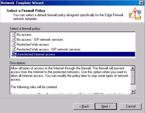 如果你是初学者,建议你使用无限制的Internet访问模板;当你比较熟悉网络和ISA Server 2004后,再使用其他更有限制的网络访问控制。