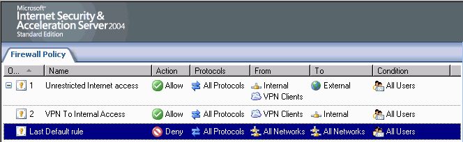这条策略允许内部网络和VPN客户网络访问Internet,注意和ISA Server 2000相对比的是,VPN客户也可以通过ISA Server 2004防火墙来访问Internet。在ISA Server 2000中,你不能将VPN客户设置为SecureNAT客户端,所以,你必须将VPN客户设置为Firewall客户端,才能让它访问Internet。在ISA Server 2004中,已经解决了这个问题,VPN可以端可以作为SecureNAT客户端来访问Internet。