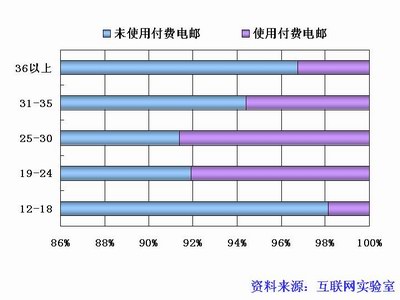 互联网实验室研究发现:使用付费电子邮件的网民多集中在19-30岁之间,其中25-30岁之间的比例最高,达到8.6%,19-24岁的比例也相对较高,达到8%。而18岁以下和31岁以上的使用比例则大幅下降,其中12-18岁的使用比例最低,为1.9%。