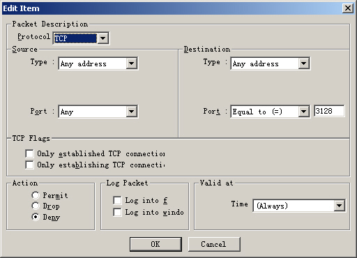 具体操作如下:单击“Settings→Advanced→Packet Filter”,选择Incoming面板,找到接外网的网卡,单击Add按钮,会显示Add Item对话框,把Protocol选为TCP,Destination中的Port选=3128,Action中选Deny(如图1所示)。