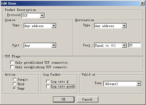 笔者查看Sendmail的LOG,结果没发现从单位中发出很多垃圾邮件,正在郁闷时,突然想起这段时间正在大闹Internet的网络天空“NetSky”和“MyDoom”病毒,这两种病毒都会自动发出很多垃圾邮件,特别是网络天空,它自带SMTP服务功能。不需要利用单位的Sendmail,就直接可以发信。单位的Sendmail的LOG中当然也不会有记录了,于是马上到网关机WinRoute中对连接内网的网卡加上不能向外连接25号端号的限制,具体设置如图2所示。