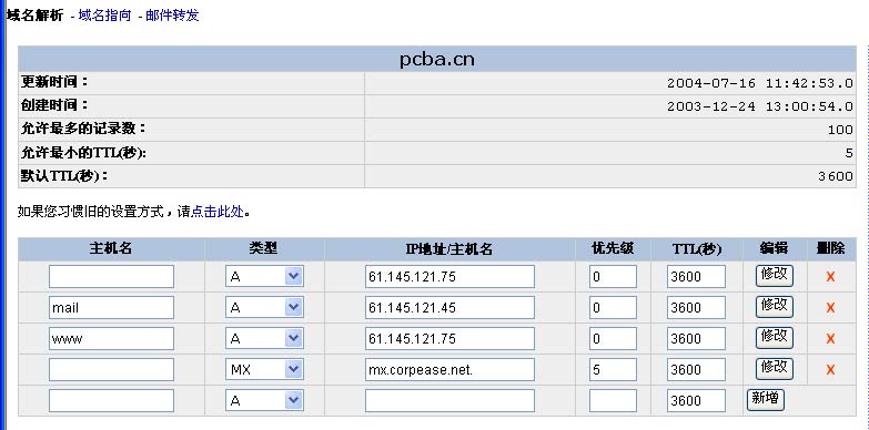 6、进入这个页面:https://www.dns-diy.com/zone_edit.aspx?id=38414。在下面的页面中的MX类型后面输入mx.corpease.net. (注意NET后面要有一个 . 上面的A记录及WWW的A记录都指向虚拟主机的IP。如果是我们的静态虚拟主机,请将IP指向61.145.121.75 如果是我们的asp 的主机:请将ip:指向:61.145.121.76 .切记在输入每一条记录后都要点击后面的修改按钮让其生效。