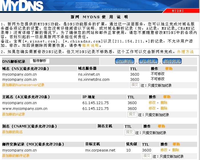 5、点击MyDns 按钮,会弹出下一个界面:点击添加新的A记录:在前面的框中不填入任何资料,如果是我们尚易的虚拟主机,请在后面的框中输入我们的主机IP:61.145.121.75 ,点击提交,再点击添加新的A记录,在前面输入www 在后面的框中输入61.145.121.75 .点击提交即可。这样当用户在网址中输入mycompany.com.cn 和www.mycompany.com.cn 都可以打开网页。然后在邮件交换记录下面点击:添加新的邮件记录,在后面的目标主机框中输入:mx.corpease.net 点击提交即可。