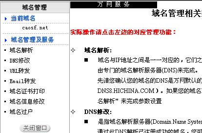 1、如果域名是在中国新网www.net.cn 注册的,并且DNS是由中国万网来提供的,关于域名的DNS服务器由哪家公司提供,可能通过www.checkdomain.com 输入域名来进行查询到:例如caosf.net 在www.checkdomain.com中查询到的结果就是: