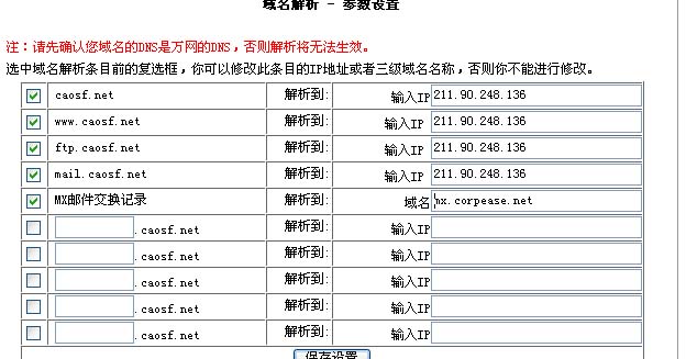 5、分别选中域名前面的小选项,在后面的A记录框中输入您的主机IP(这个IP地址根据主机提供商提供的IP来输入,如果没有主机,为了保证邮件正常接收和发送到国外的特殊邮箱服务器,建议将域名的A记录全部设为61.145.121.75 ,然后选中mx邮件交换记录,在后面的框中输入:mx.corpease.net 点击:保存设置。