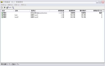 配额项:单击这个按钮可以打开配额项对话框,在这个对话框中,可以通过配置菜单分别定制每个用户磁盘空间。也可以删除老用户空间配额限制。另外它的主界面就是一个用户配额监控器。如图9: