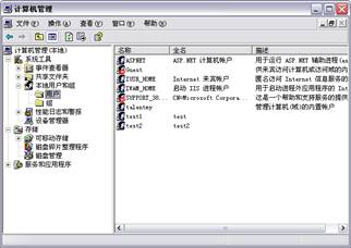 先打开计算机管理(要是服务器已经升成为AD模式,就打开Active Directory用户与计算机),点击展开本地用户和组,右键单击用户模块分别创建两个用户帐号。我这里建立的用户帐号依次为test1、test2。注意,为了安全考虑,请在组的模块中新建一个组。把用于虚拟主机的用户归纳到里面,并把用户原来隶属于的User组删除。(作为一个称职的管理员,需要注意的小细节是很多的,不然一个错误的细节就会引起灾难)如图1: