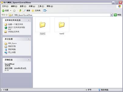 建立好帐号后,就在FTP空间目录下先建立一个LocalUser文件夹。然后对应所使用的帐号建立子文件夹。如:要是FTP空间指定的是D:\ WEB_Space文件夹,那就在这个文件夹下创建一个LocalUser文件夹。接着建立两个子文件夹:test1、test2.如图2: