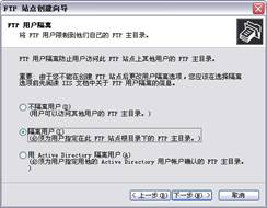 接着我们需要建立FTP 用户隔离站点。这个功能是以前版本的IIS中FTP站点所没有的,FTP 用户隔离为 Internet 服务提供商 (ISP) 和应用服务提供商提供了解决方案,使他们可以为客户提供上载文件和 Web 内容的个人 FTP 目录。FTP 用户隔离通过将用户限制在自己的目录中,来防止用户查看或覆盖其他用户的 Web 内容。因为顶层目录就是 FTP 服务的根目录,用户无法浏览目录树的上一层。在特定的站点内,用户能创建、修改或删除文件和文件夹。FTP 用户隔离是站点属性,而不是服务器属性。无法为每个 FTP 站点启动或关闭该属性。所以在建立FTP站点的时候就应该选择好,不然站点建立以后,将无法修改。