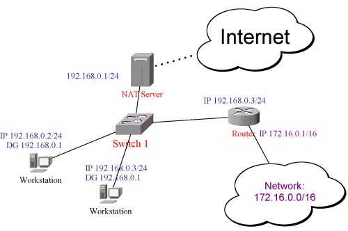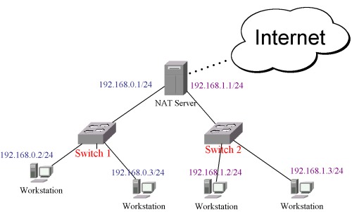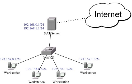 图一是一个在相同网络接口上实现多个网络的实例。在NAT Server的内部接口上同时具有192.168.0.1/24和192.168.1.1/24两个IP,而且内部网络中也存在这两个相应的网段,内部两个网段的客户的默认网关设置为NAT Server内部接口上对应网段的IP。在具体的配置上,ISA Server 2004需要你在内部网络中明确这两个网段,而KWF则是从接口的IP配置中获取这两个网段的信息,只要你明确允许这两个网段的内部用户访问外部网络,那么这两个网段的计算机都可以正常的访问外部网络。对于这两个网段之间用户互访,则需要通过防火墙策略来设置。除了ISA Server 2004上具有对应的路由外,你还得建立一条防火墙策略以允许内部网络访问内部网络。同样的,KWF中专门有个路由定义的选项,如果你定义了这条路由,KWF会转发给对应的客户,就算收到、发出数据包的是同样的接口。
