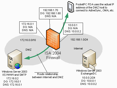 下图显示了我们这篇文章中使用的示例网络。下图展示了一种Internet和DMZ网段之间的路由关系。当PocketPC PDA客户连接到位于DMZ网段的服务器,它用于建立连接的名字解析到DMZ主机的实际IP地址,在我们这个例子中是172.16.0.2。路由关系允许我们做DNS解析和保存映射到DMZ主机到实际IP地址的DNS记录。ISA Server 2004访问策略让DMZ主机对Internet客户可见。