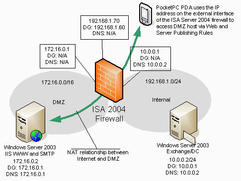 但是,你同样可以使用发布策略来对Internet用户发布位于DMZ的主机。在这个例子中,位于Internet的PocketPC PDA主机使用一个位于ISA Server 2004防火墙外部接口的IP地址来访问DMZ主机。注意,DMZ主机同样也有一个公共IP。即使我们使用公共IP地址,因为使用发布策略,也会执行NAT。这样允许Internet主机连接到ISA Server 2004防火墙的外部接口并且有效的隐藏DMZ主机的IP。这个NAT隐藏对于公开的服务器是一种通用的安全方法。