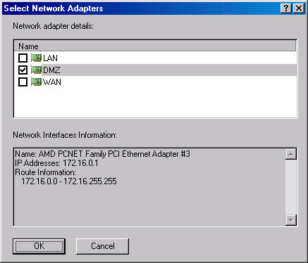 6. 在 Select Network Adapters 对话框,勾选DMZ 网络接口。注意你可以直接勾选而不需要选择网络适配器先。但是,如果你不选择网络适配器,你不能在Network Interface Information看见正确的信息。点击 OK。