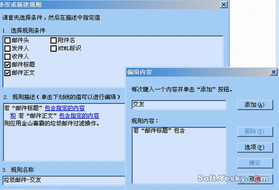小提示:大家可能注意到了,在规则内容中缺省是设置包含某个内容时,规则生效。而如果我们需要反向判断,即不包含某个内容时规则生效,该如何设置?点击“选项”按钮,通过在图4中勾选“邮件不包含下列内容”来改变。同理,我们也在“邮件正文”中添加“交友”作为判断规则的内容。