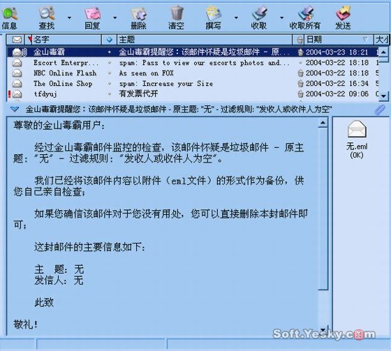 如果发现有垃圾邮件,“金山邮镖 2004”会生成一封提示邮件告之用户,以便用户进行下一步操作。图7为“金山邮镖 2004”在foxmail生成的提示邮件,邮件正文说明了将该邮件判断为垃圾邮件所使用的规则,并且将邮件打包为附件作为备份,提示用户删除或检查。
