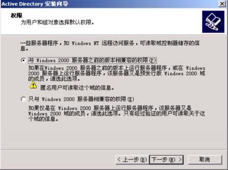 选中“与Windows2000服务器之前的版本相兼容的权限(P)”,并点击“下一步”