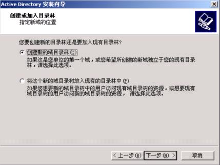 选中“创建新的域目录林(C)”并点击“下一步”: