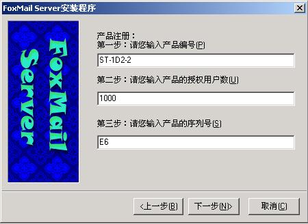 b.安装程序要求输入产品编号、授权用户数和产品序列号,请您按照您购买FoxMail Server for NT/2000时,彩盒包装中的《授权书》所给出的相应号码正确填写,注意使用大写半角字母和小写半角数字。